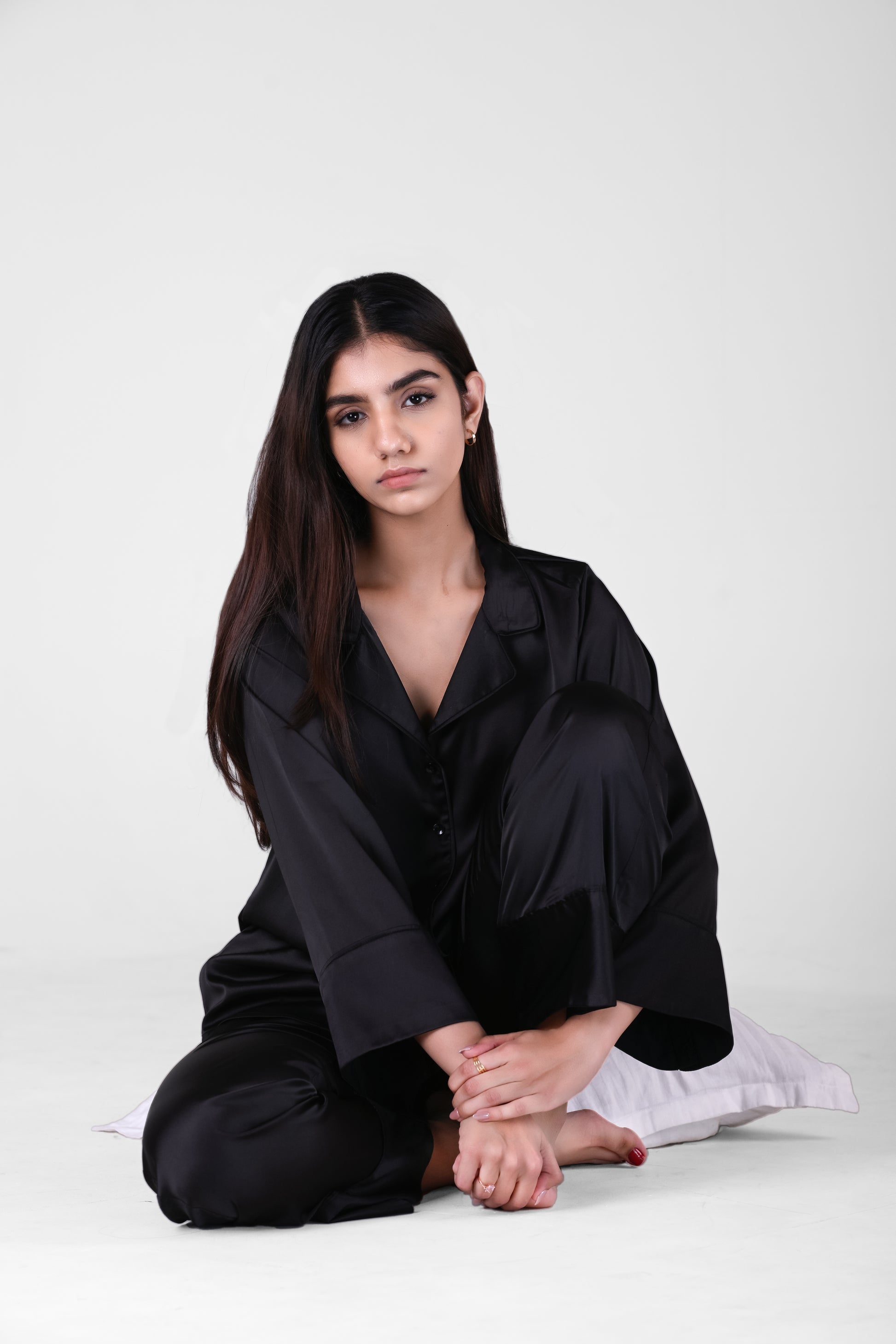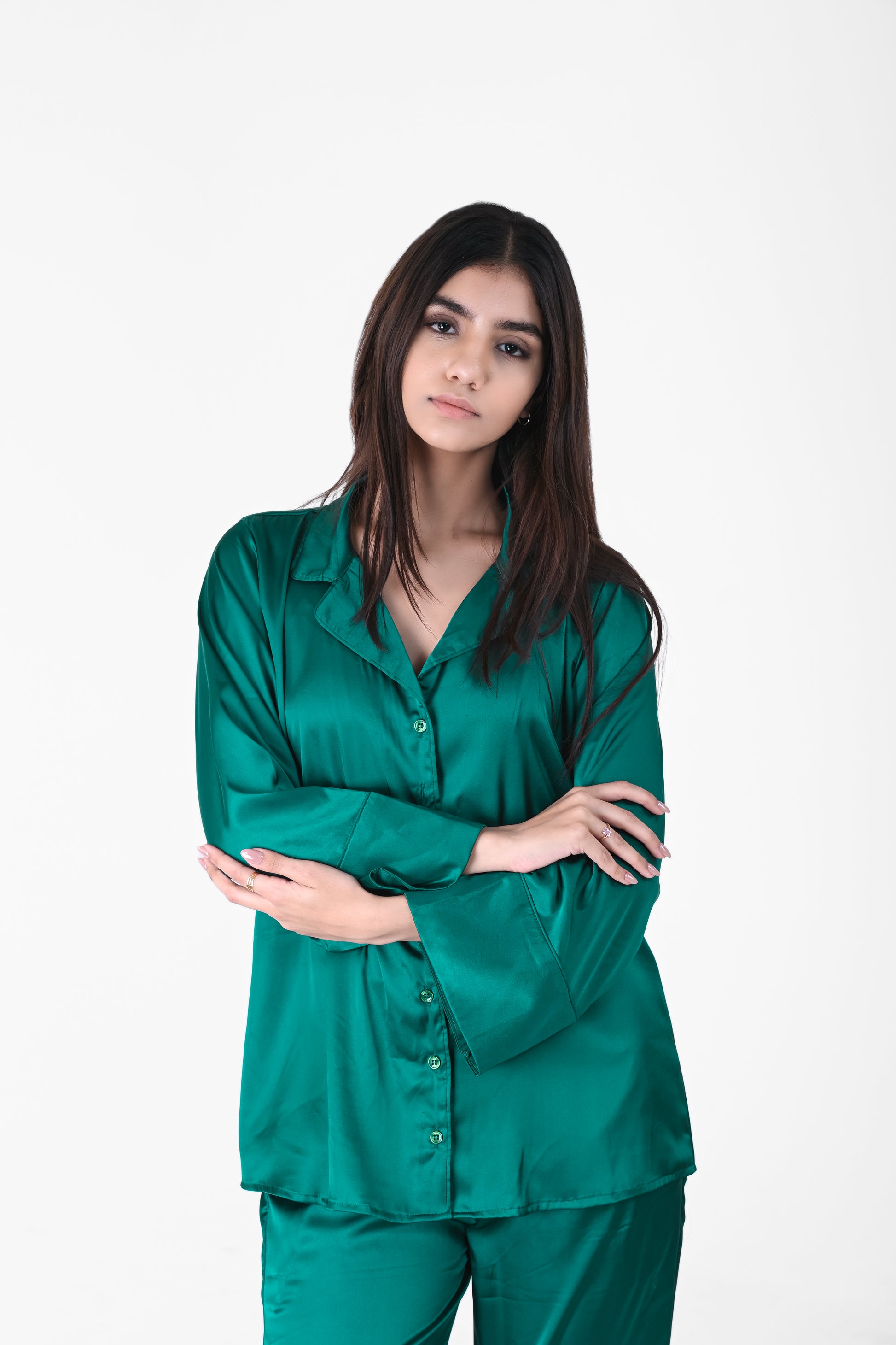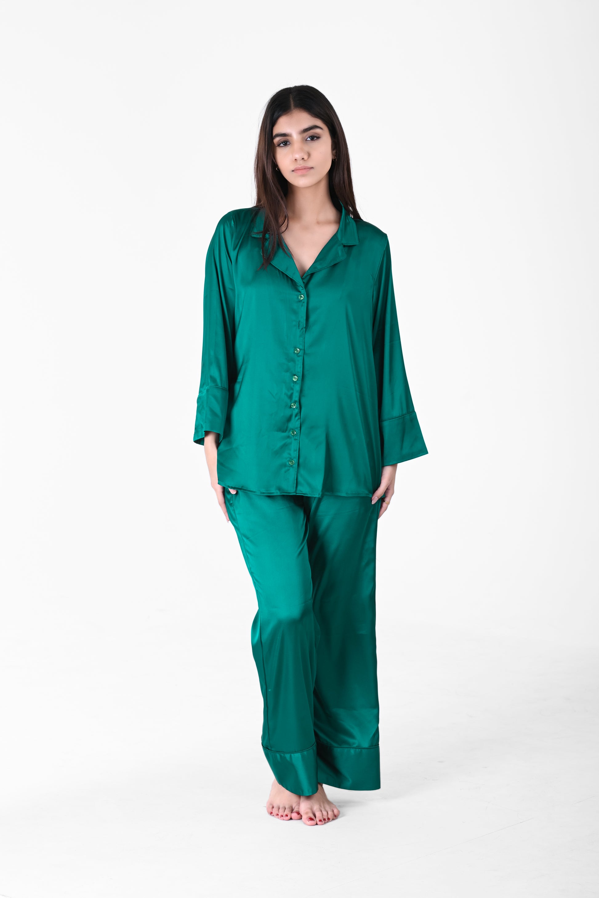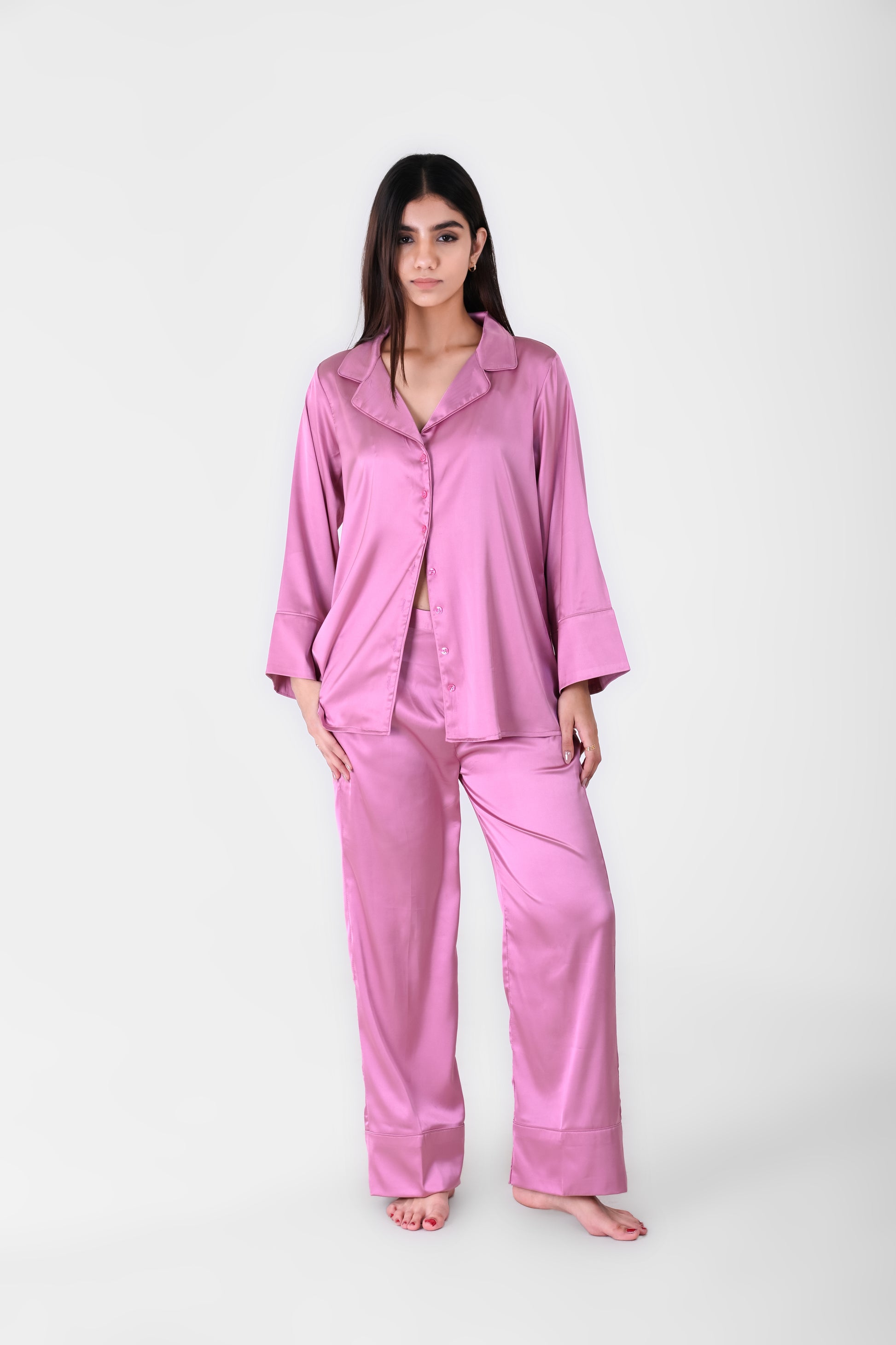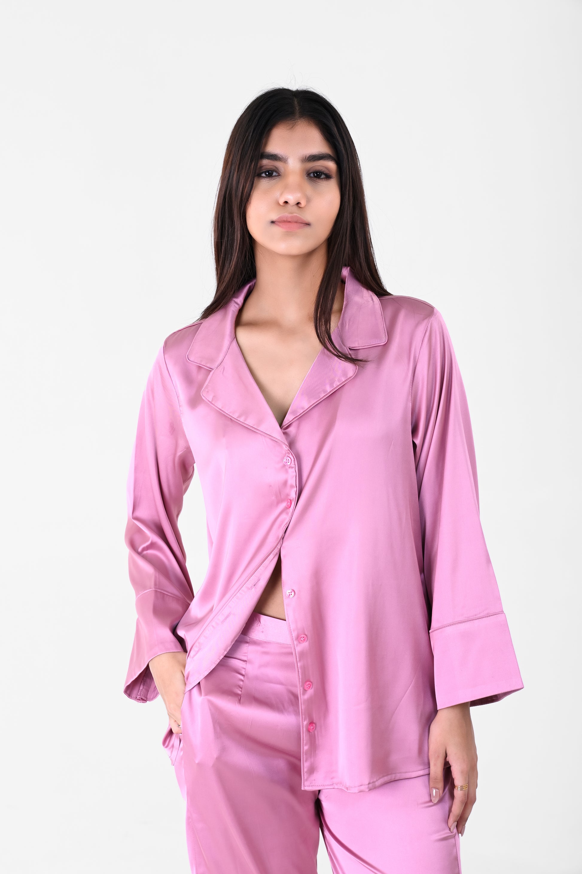 Drift into elegance with the satin night suit. Crafted from luxuriously smooth satin, this set features a relaxed-fit, button-down top with a soft collar and matching lounge pants with an elastic waistband. Perfect for cozy nights, lounging, or gifting.