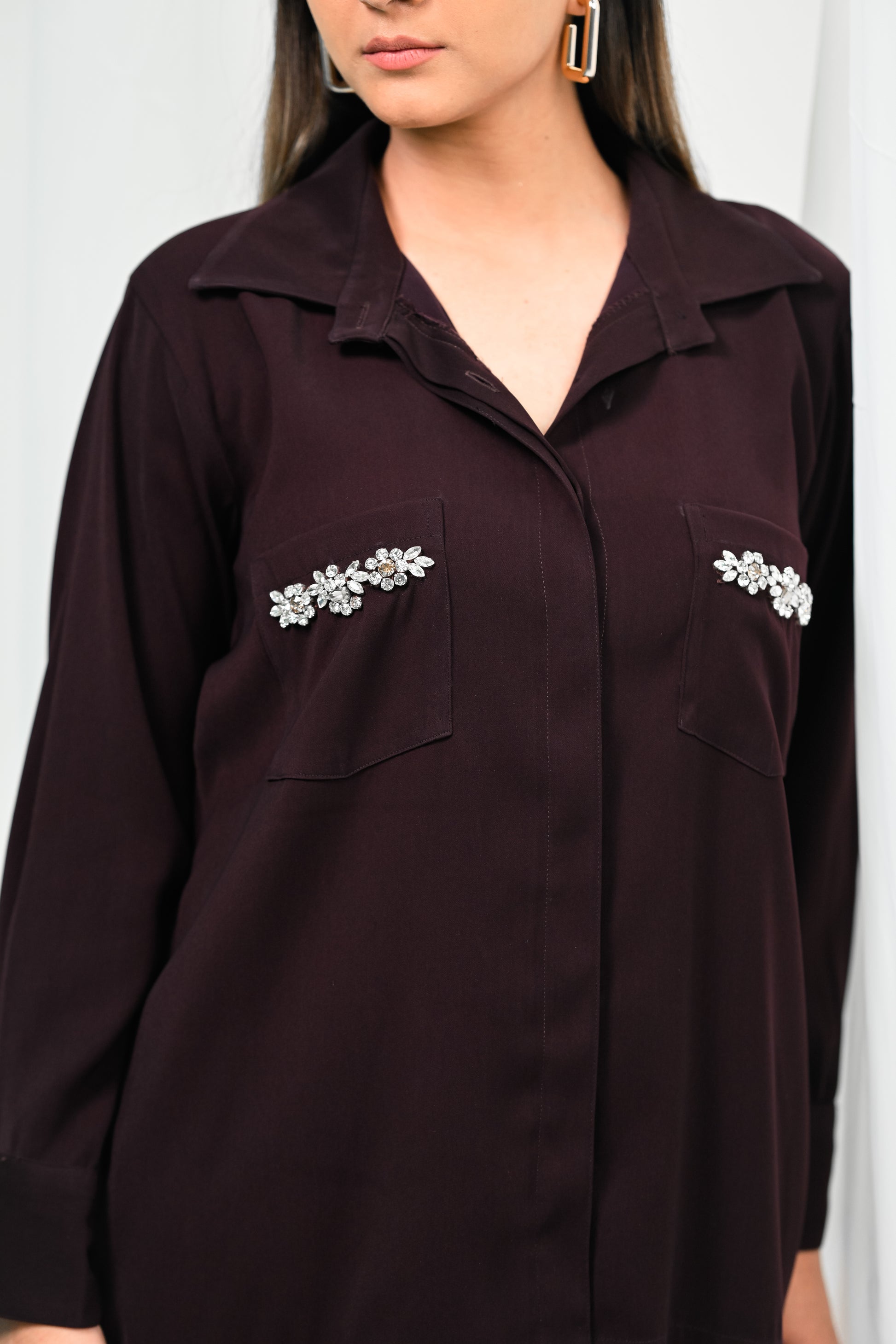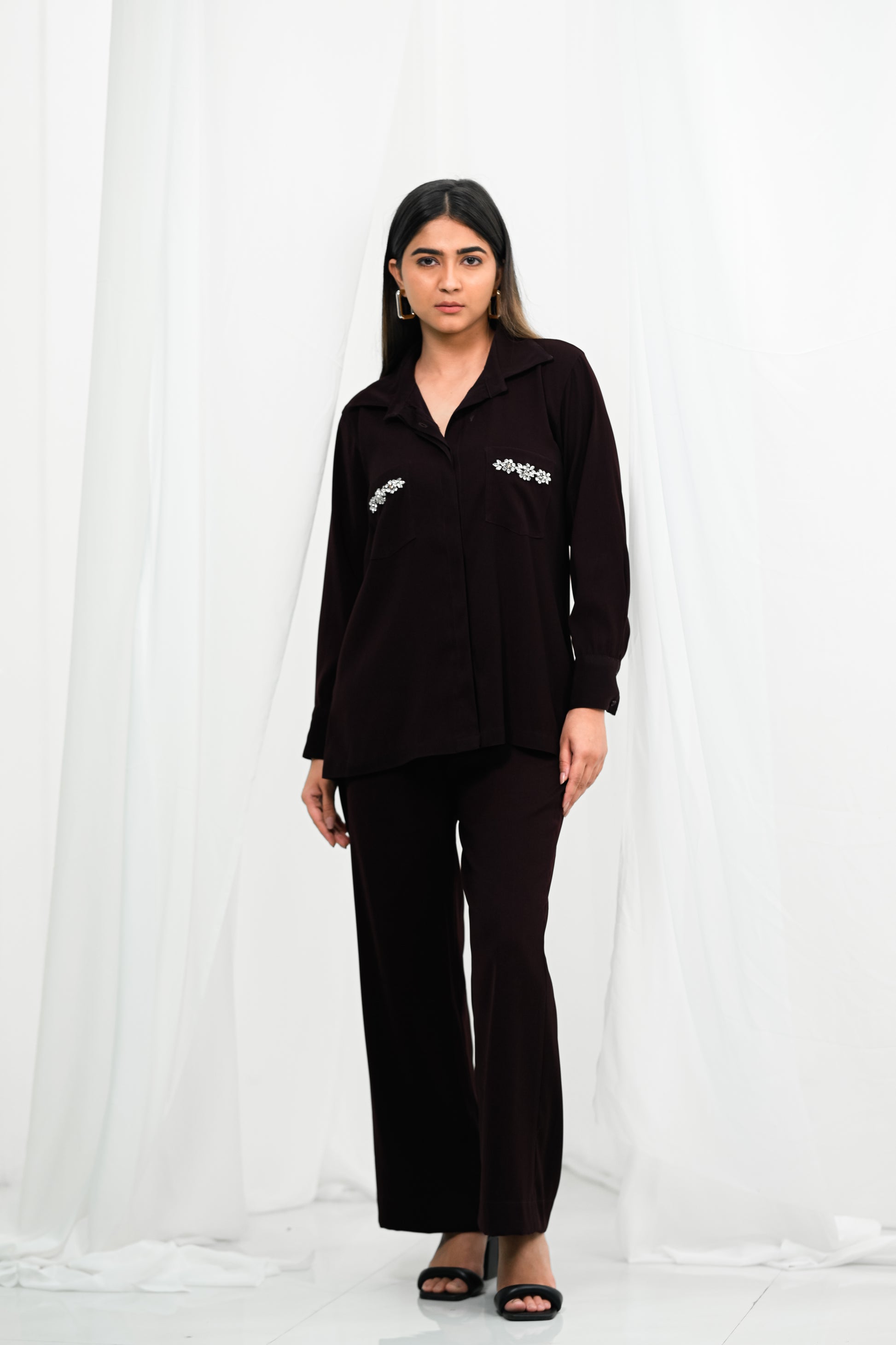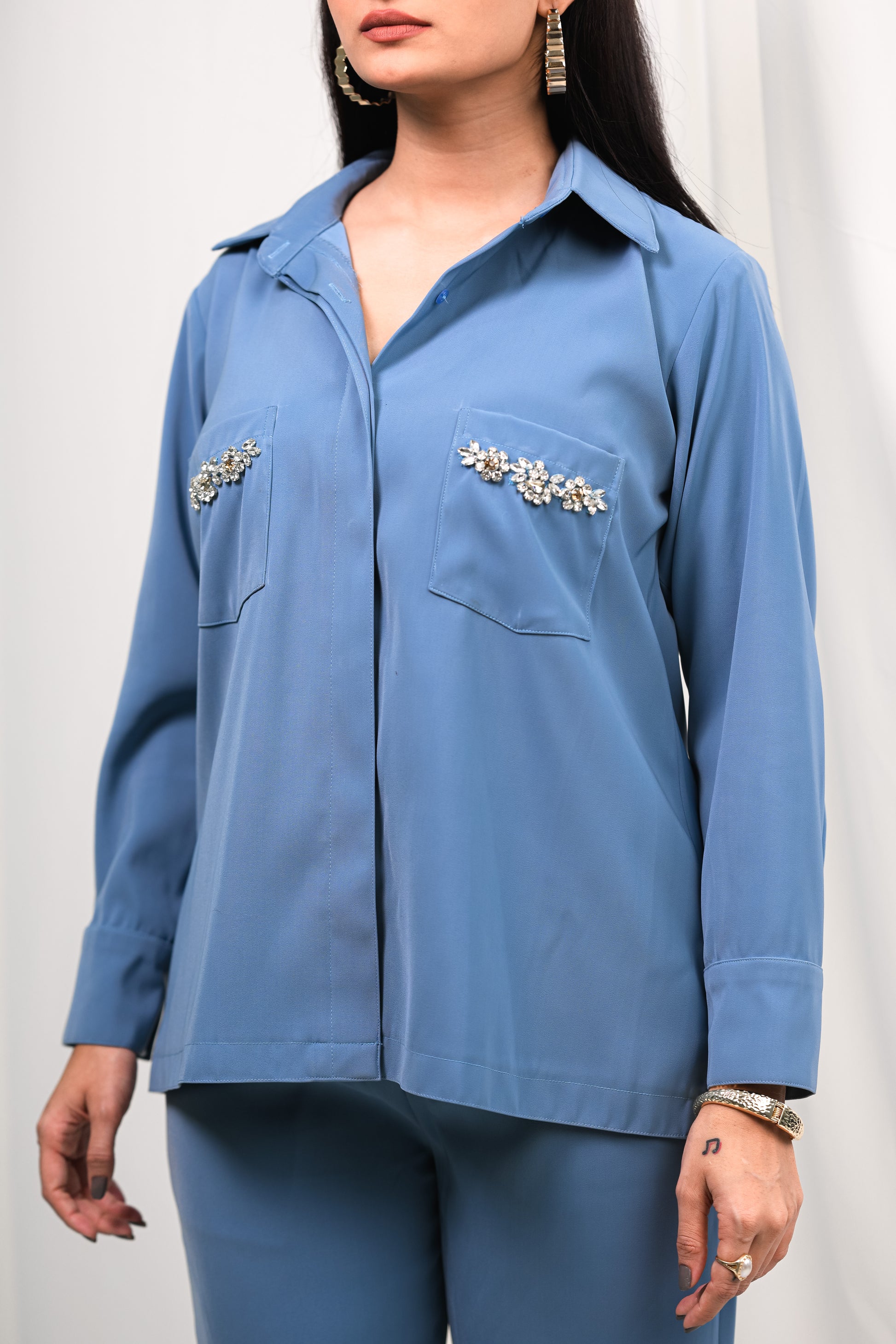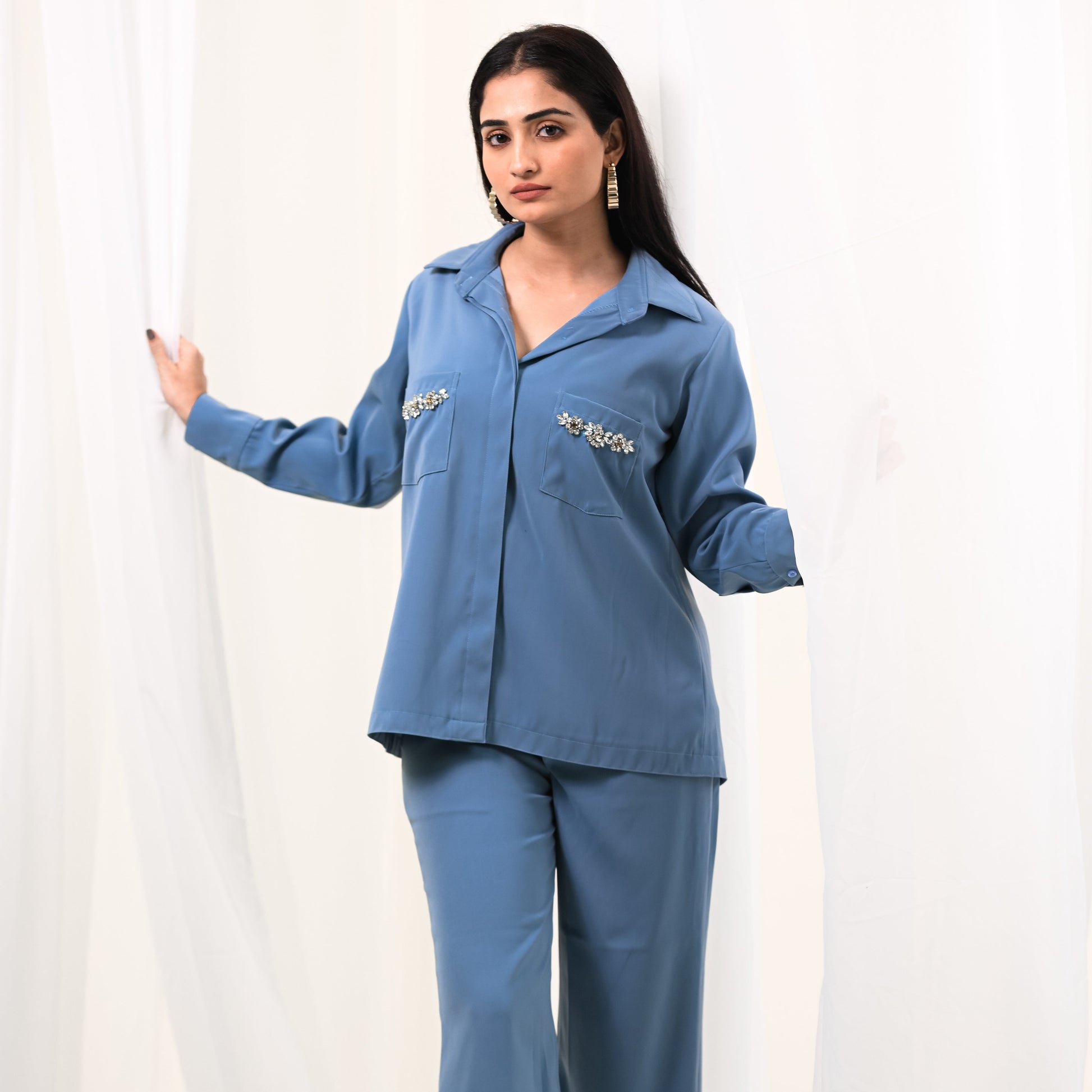 Design Details: Embellished Swarovski pockets add a luxurious and elegant touch. The co-ord set includes a detailed top with relaxed-fit pants, perfect for formal and semi-formal occasions. The top can also be paired with denim for a semi-casual look.
