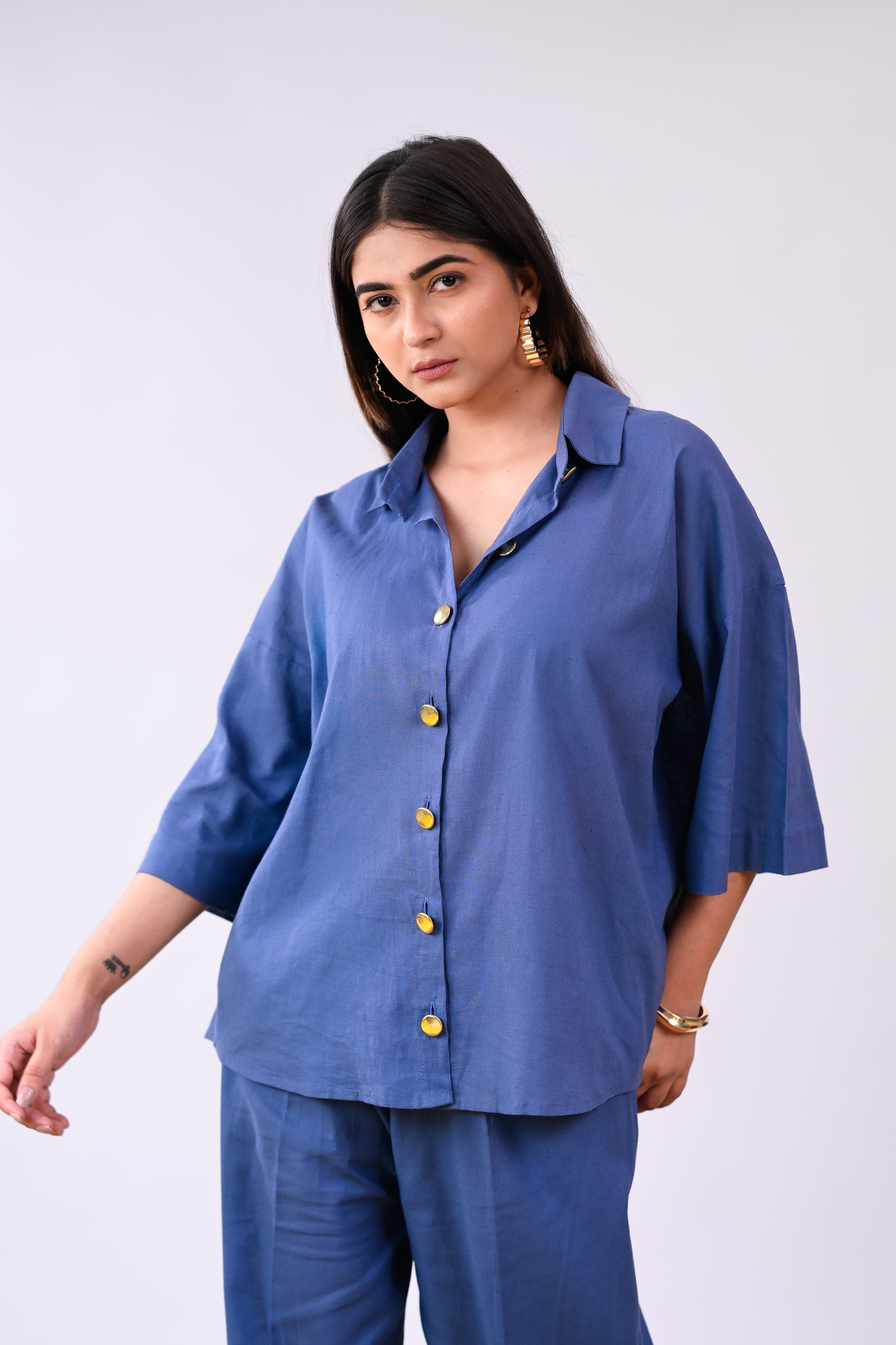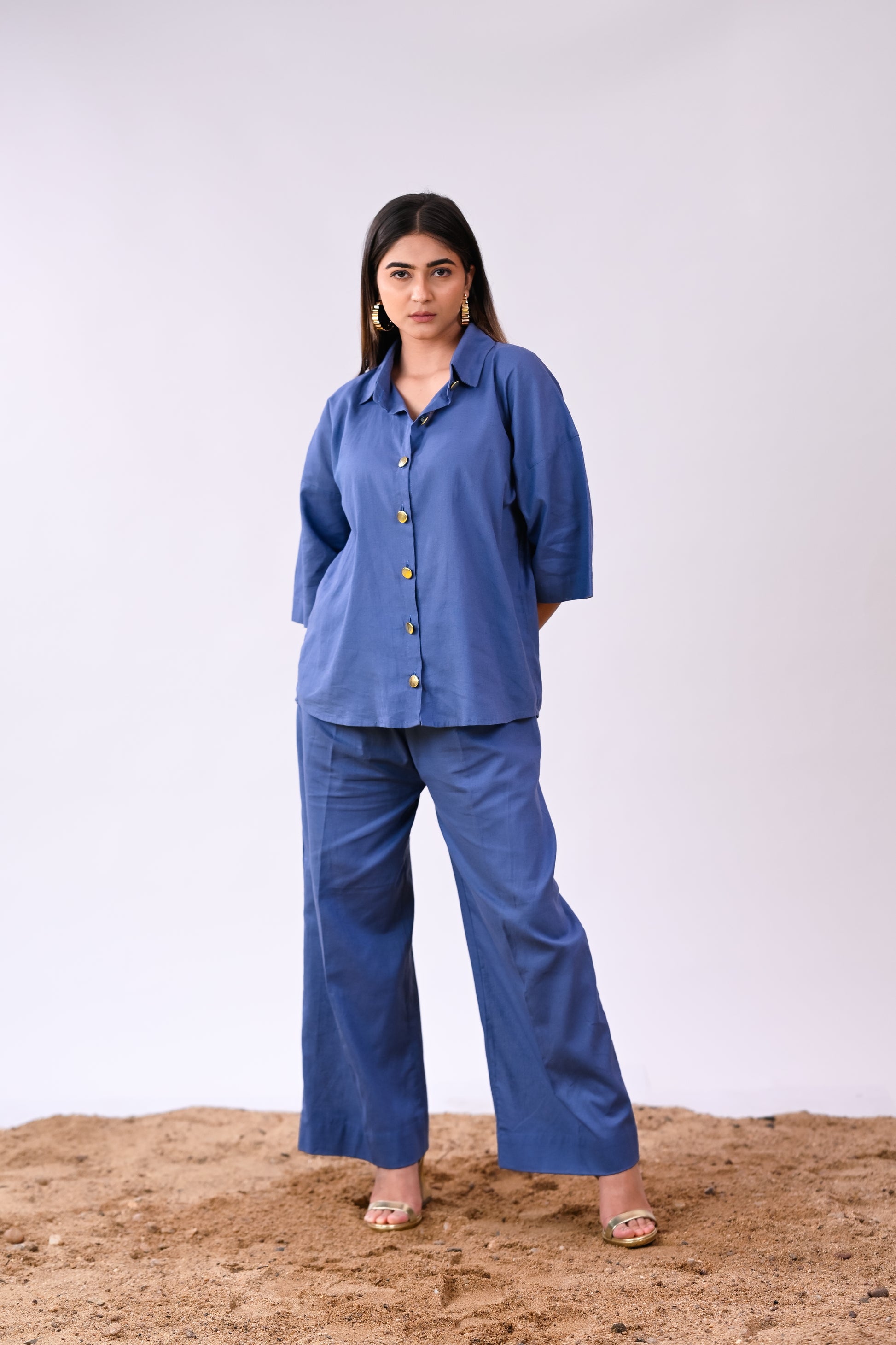 Experience the luxury of linen with our premium linen co-ord set featuring a baggy shirt with a relaxed fit pants. Golden buttons add a touch of luxury making it perfect for brunches and casual outings.